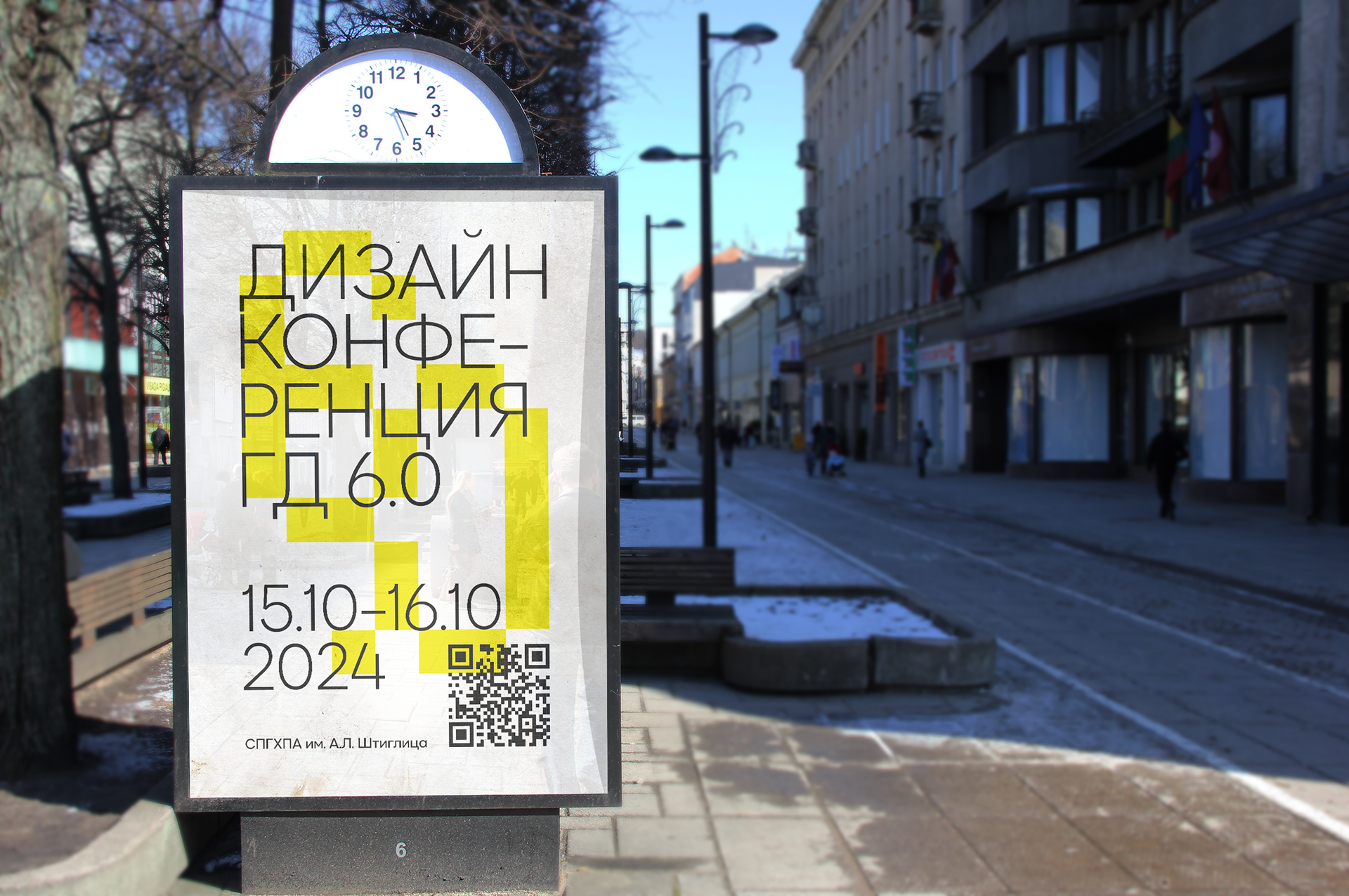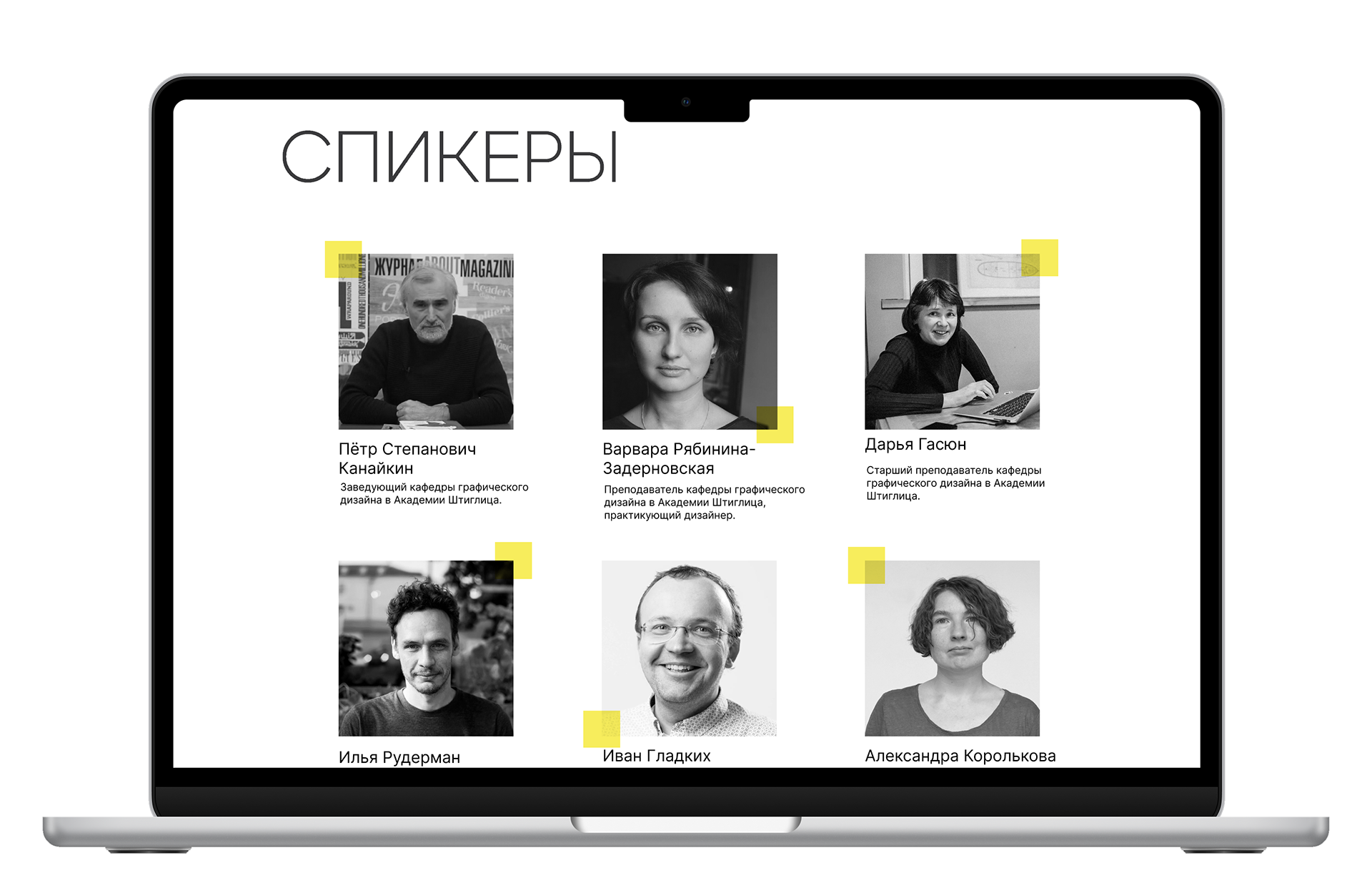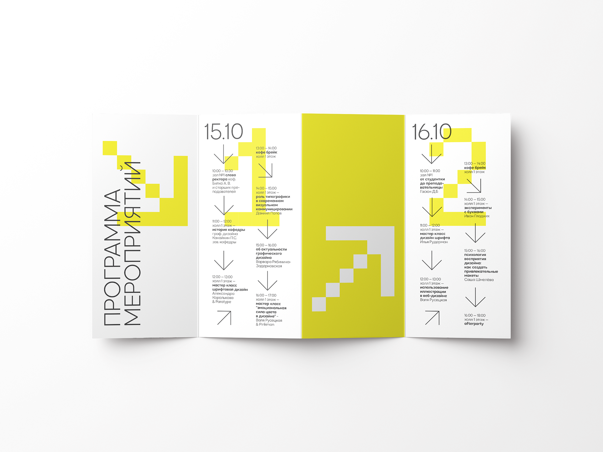 Information booklet with a schedule of conference events and a brief history of the department. Arrows as auxiliary elements of orientation. The booklet is made in the style of the conference design.