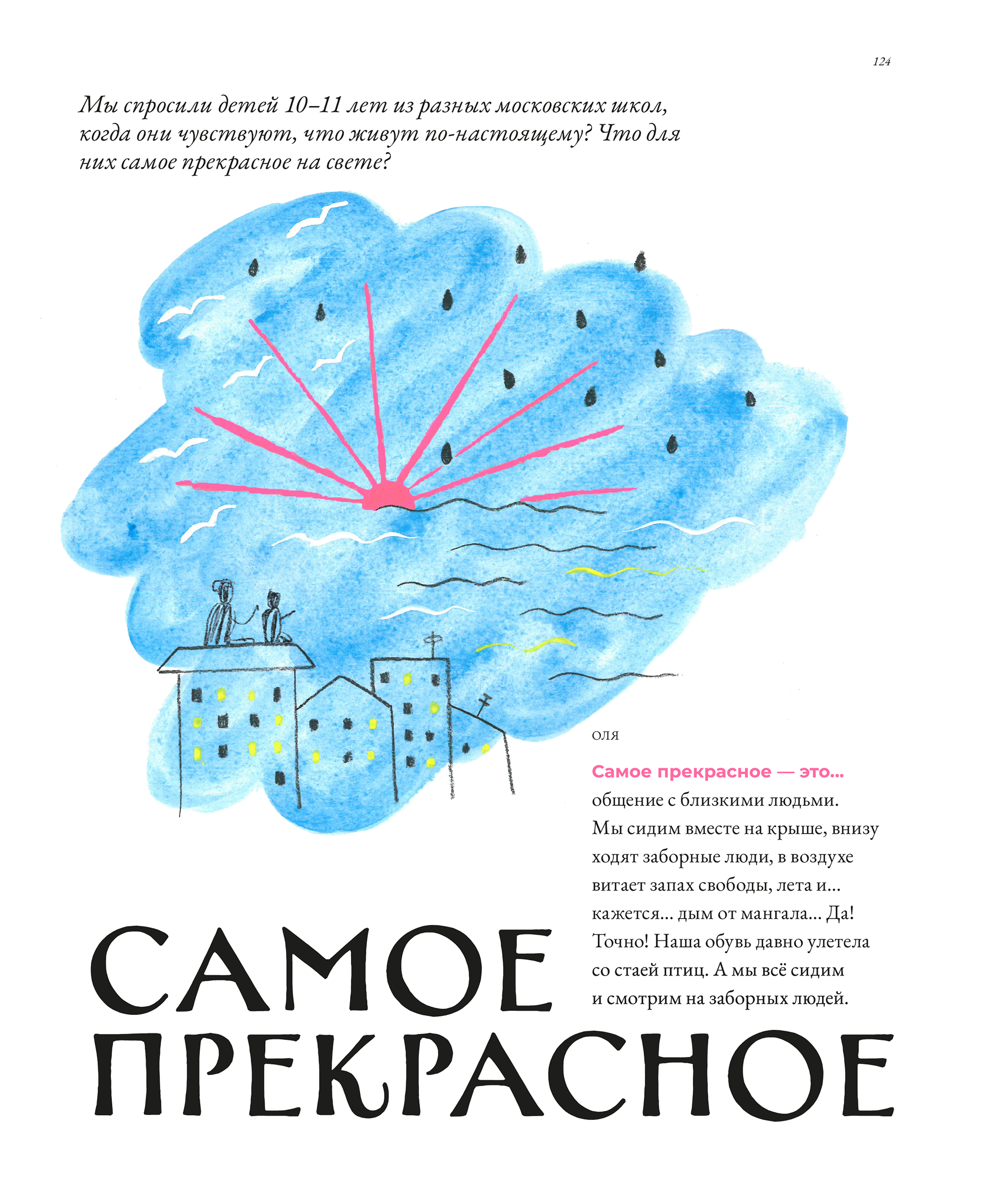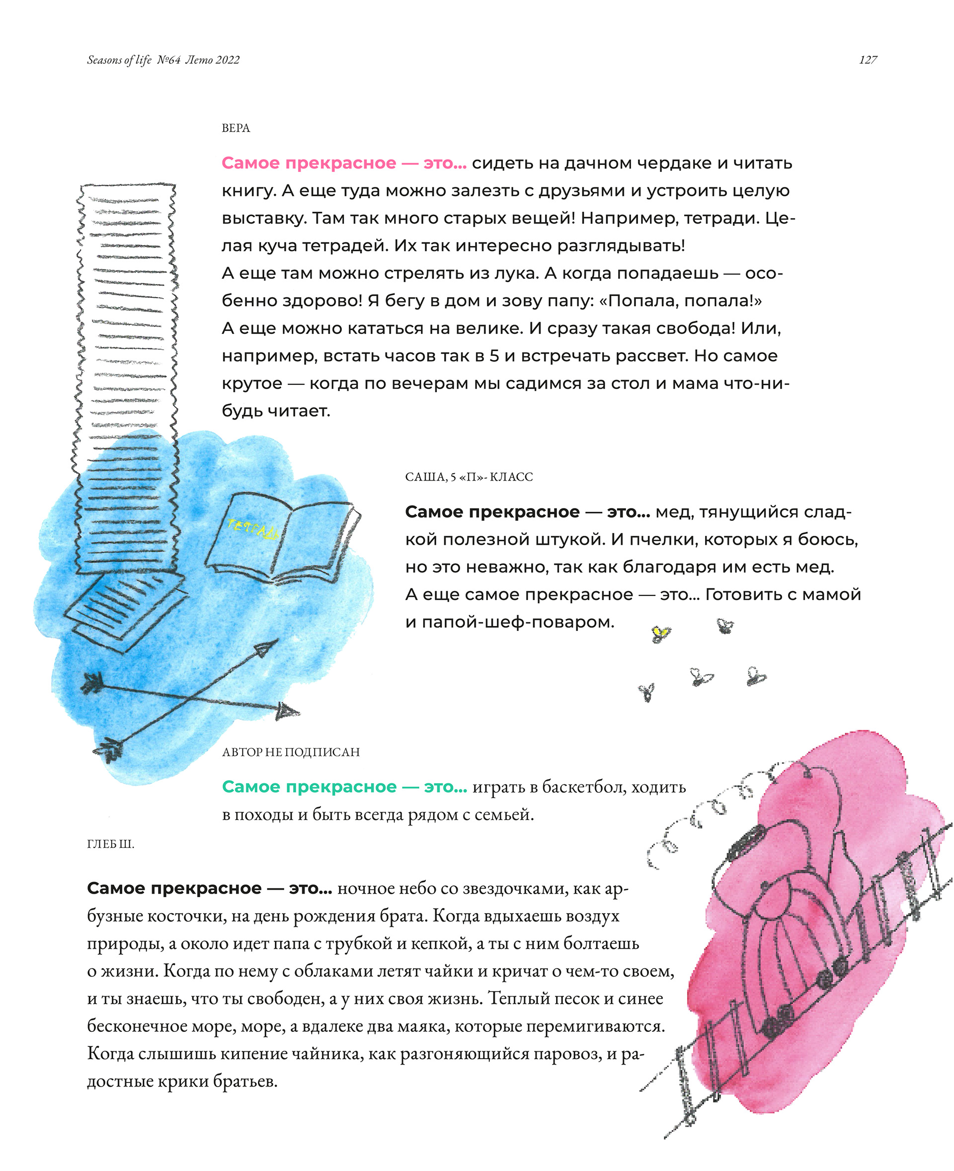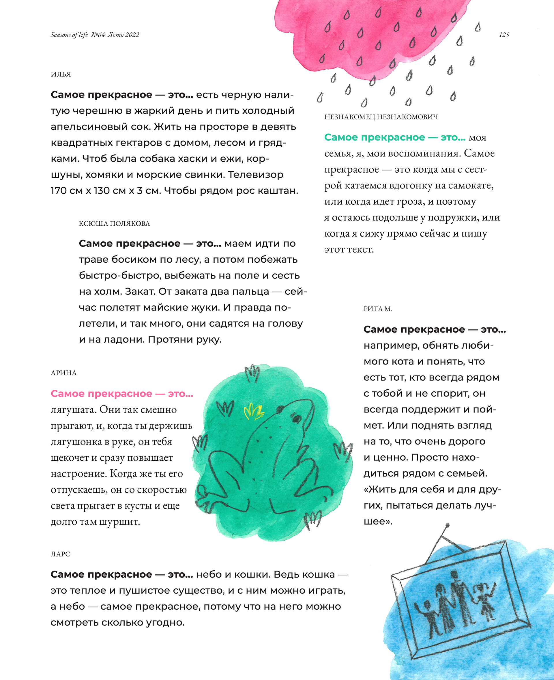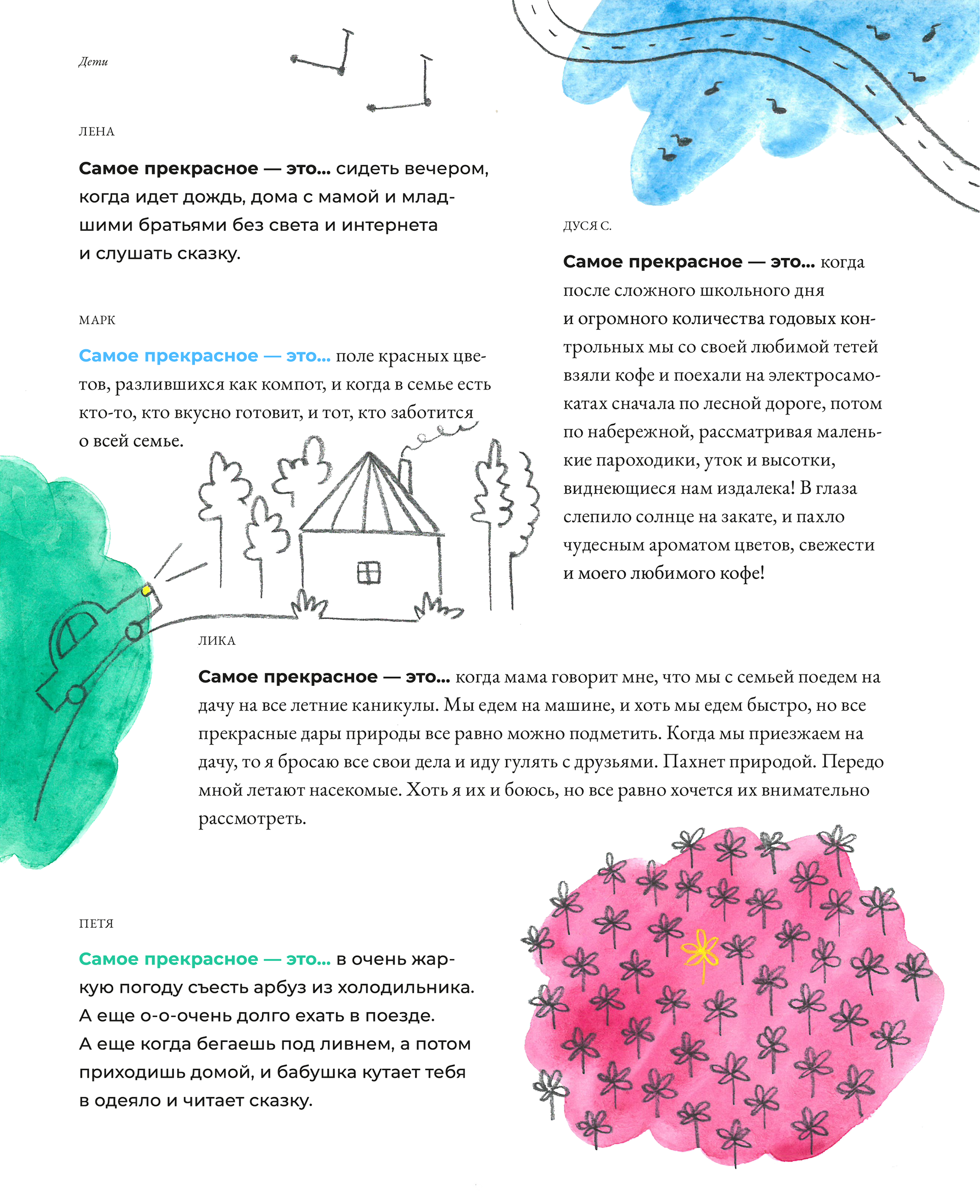 Illustrations for the magazine article 'The Most Beautiful', in which children talk about what is most beautiful for them in life. The images illustrate their stories, and are made using watercolour techniques and complemented by charcoal pencil drawings.